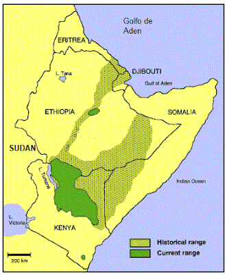 Estado: en peligro: causas: reducción de las fuentes de agua disponibles; la degradación de sus ambientes y su pérdida debido al sobrepastoreo, la competencia por los recursos, la caza y las enfermedades.
